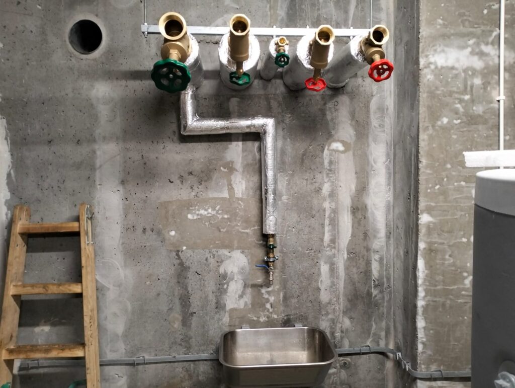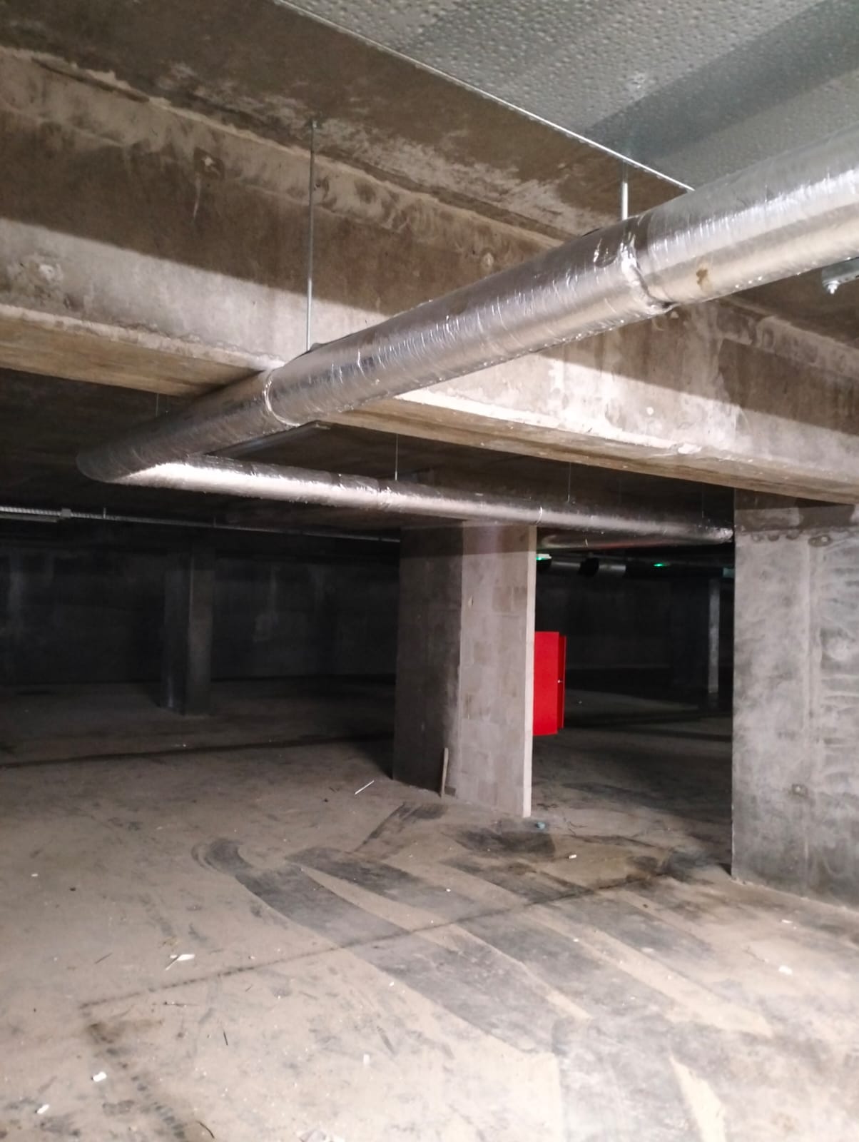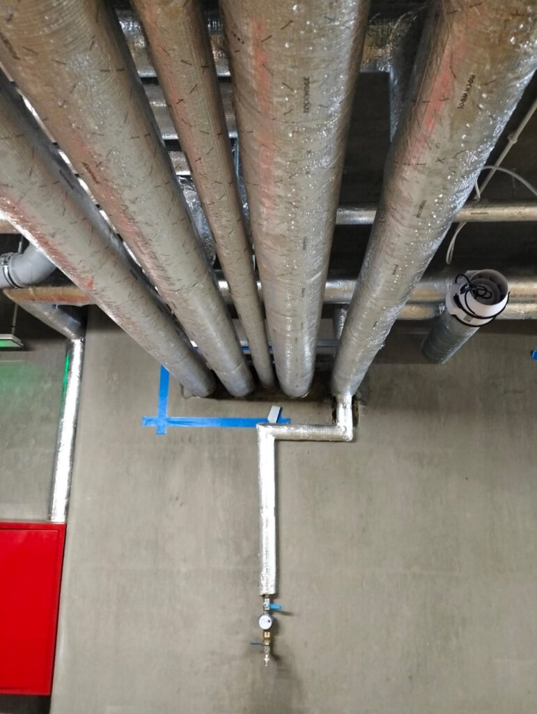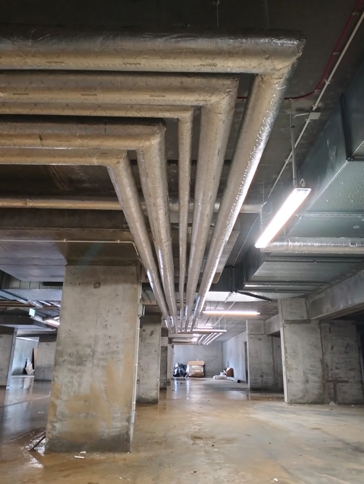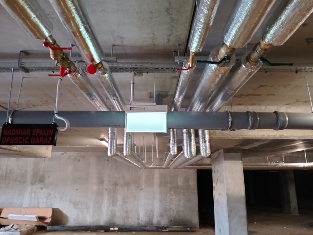 Prace rozpoczęto od montażu głównych przewodów instalacyjnych prowadzonych wzdłuż sufitu garażu podziemnego. Rurociągi zostały wykonane ze stali i pokryte izolacją termiczną w kolorze srebrnym, która minimalizuje straty ciepła oraz chroni przed kondensacją. Widoczne na zdjęciach przewody tworzą przemyślany układ, w którym rury prowadzone są równolegle oraz w logicznych grupach odpowiadających poszczególnym instalacjom. Wszystkie przewody zamocowano do konstrukcji żelbetowej za pomocą profesjonalnych uchwytów stalowych z możliwością kompensacji wydłużeń termicznych.