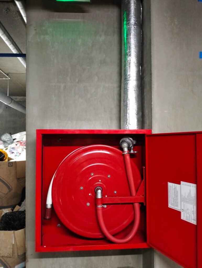 Kluczowym elementem systemu jest rozdzielacz hydrantowy zamontowany na ścianie garażu, wyposażony w szereg mosiężnych zaworów z czerwonymi i zielonymi pokrętłami. Układ zawiera zawory odcinające dla poszczególnych pionów oraz zabezpieczenia w postaci zaworów bezpieczeństwa. Pod rozdziela czem zamontowano umywalkę techniczną ze stali nierdzewnej służącą do prac konserwacyjnych. W strategicznych punktach garażu zainstalowano czerwone szafki hydrantowe wyposażone w automatyczne bębny z wężem przeciwpożarowym oraz dyszą. Szafki są łatwo dostępne i oznakowane zgodnie z przepisami przeciwpożarowymi.