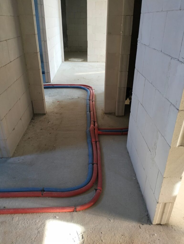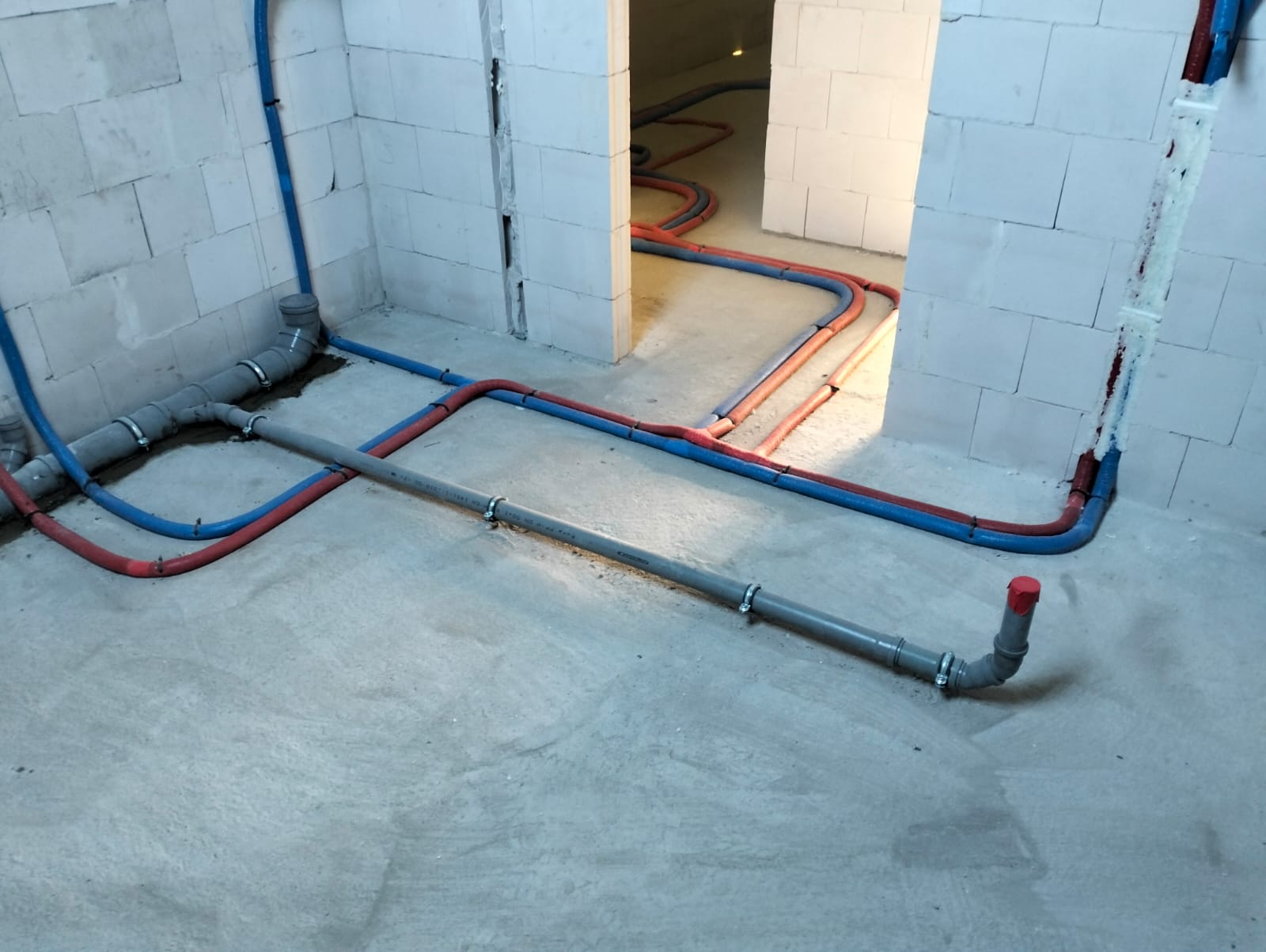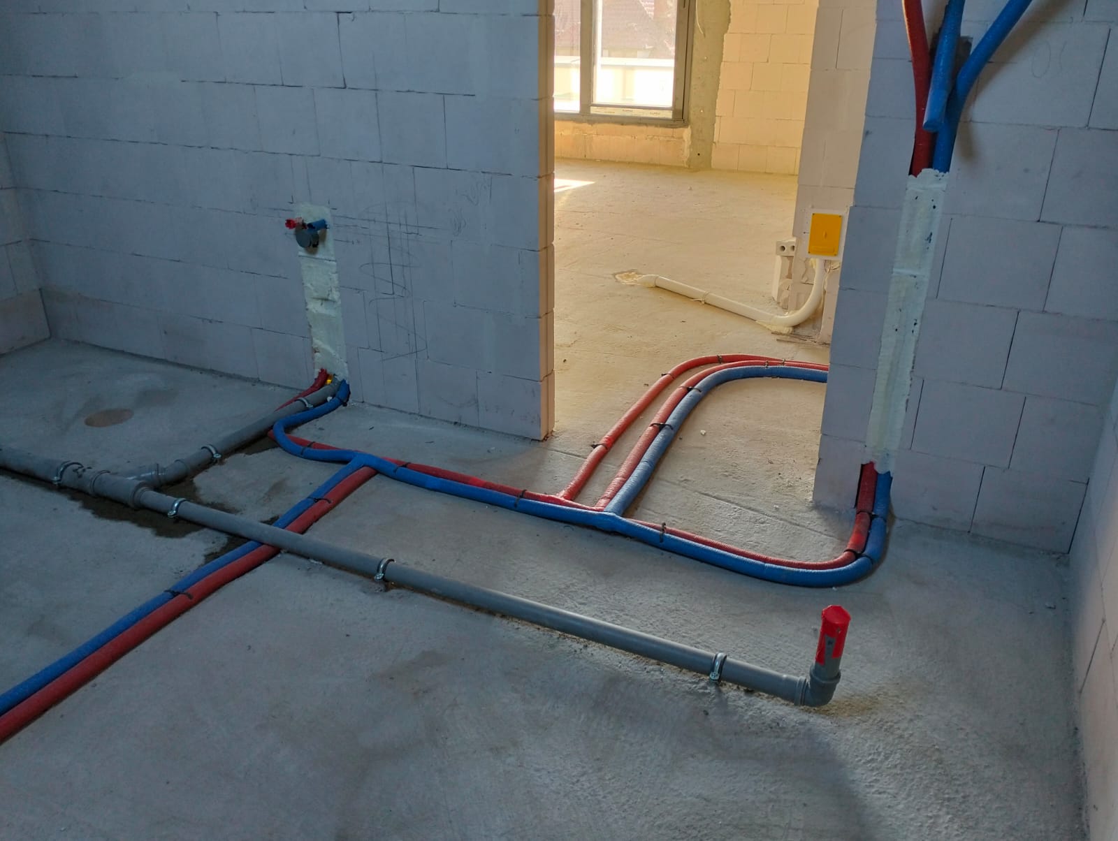 Realizacja kompleksowej instalacji wodno-kanalizacyjnej w nowo budowanym domu parterowym na etapie surowym zamkniętym. Projekt obejmował rozprowadzenie przewodów w posadzce z zachowaniem systemu kolorystycznego oraz montaż podejść do wszystkich punktów sanitarnych. Instalacja została wykonana z użyciem rur wielowarstwowych oraz kanalizacyjnych z pełnym przygotowaniem pod wylewkę betonową.