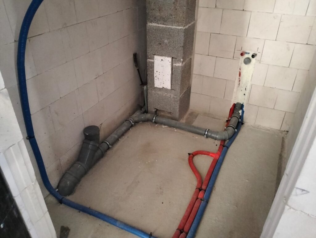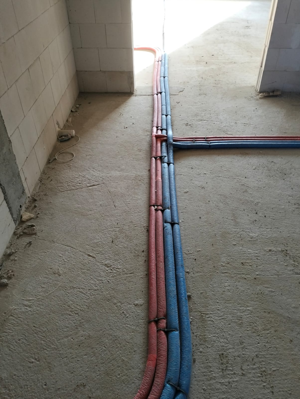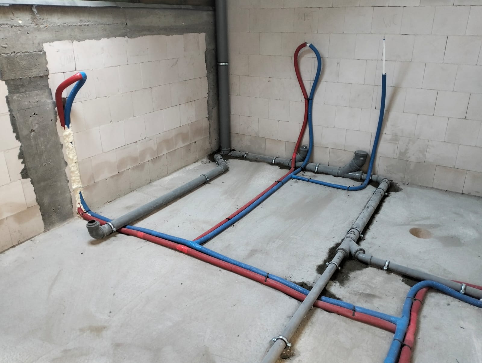 Realizacja kompleksowej instalacji wodno-kanalizacyjnej w nowo budowanym domu parterowym na etapie surowym zamkniętym. Projekt obejmował rozprowadzenie przewodów w posadzce z zachowaniem systemu kolorystycznego oraz montaż podejść do wszystkich punktów sanitarnych. Instalacja została wykonana z użyciem rur wielowarstwowych oraz kanalizacyjnych z pełnym przygotowaniem pod wylewkę betonową.