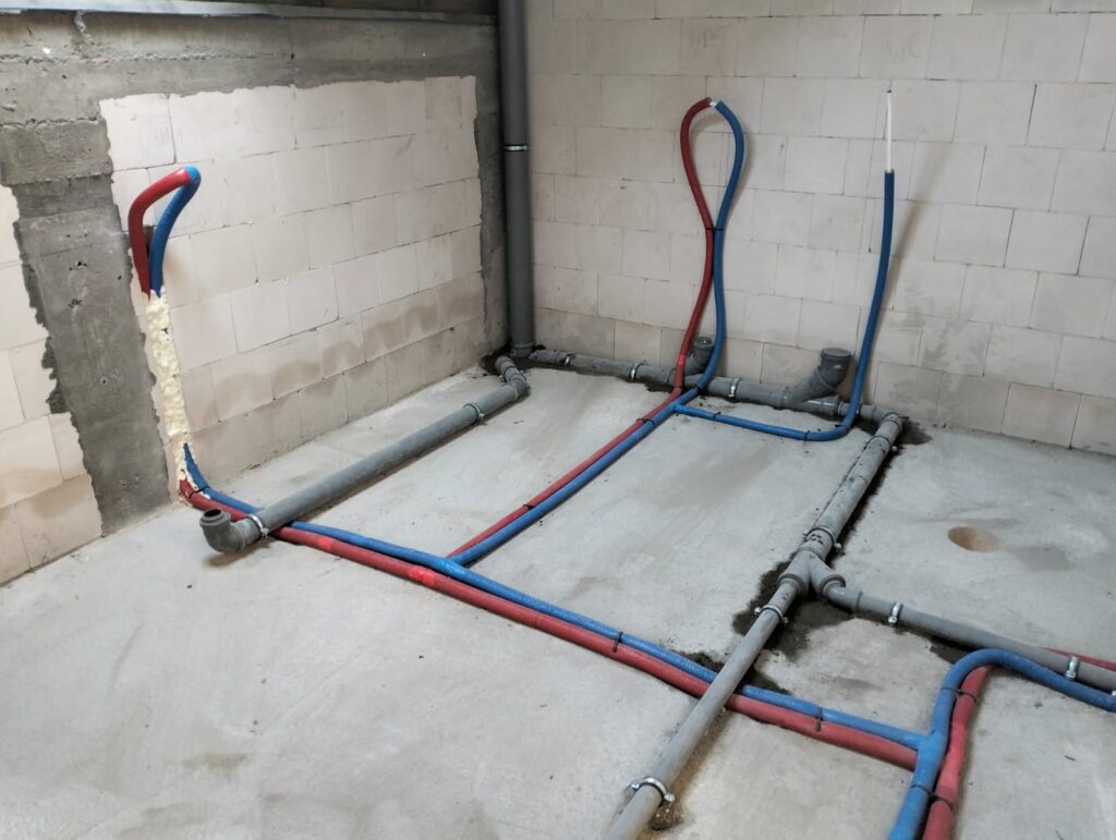 Prace rozpoczęto od precyzyjnego wytyczenia tras przebiegu instalacji zgodnie z dokumentacją projektową oraz rozmieszczeniem armatury sanitarnej. System został wykonany z kolorystycznym podziałem przewodów – niebieskie rury oznaczają wodę zimną, czerwone wodę ciepłą, a szare rury kanalizacyjne. Takie rozwiązanie znacząco ułatwia identyfikację instalacji podczas montażu oraz w trakcie ewentualnych przyszłych prac serwisowych lub modernizacyjnych. Wszystkie przewody zostały ułożone w posadzce, co pozwala na całkowite ich ukrycie pod wylewką oraz finalnym wykończeniem podłogi.