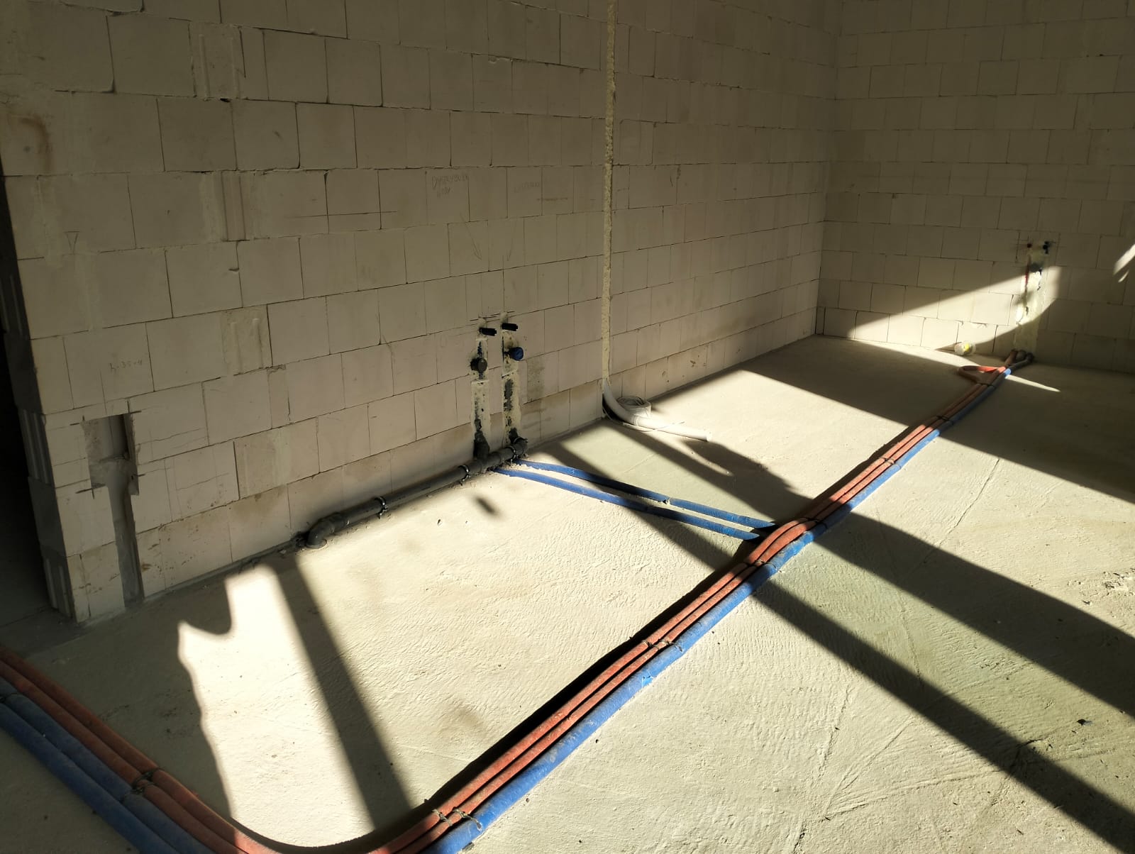 W łazienkach oraz kuchni wykonano złożone układy rozdzielające wyposażone w trójniki, łuki oraz przejścia. Przewody zimnej i ciepłej wody prowadzono równolegle, zachowując odpowiednie odstępy technologiczne oraz estetyczny wygląd całej instalacji. Wszystkie rury zostały zamocowane do podłoża za pomocą obejm systemowych, które zabezpieczają je przed przesunięciem w trakcie wykonywania wylewki. W miejscach przejść przez ściany murowane zastosowano odpowiednie osłony oraz uszczelnienia, a zmiany kierunków wykonano za pomocą łuków minimalizujących opory przepływu.