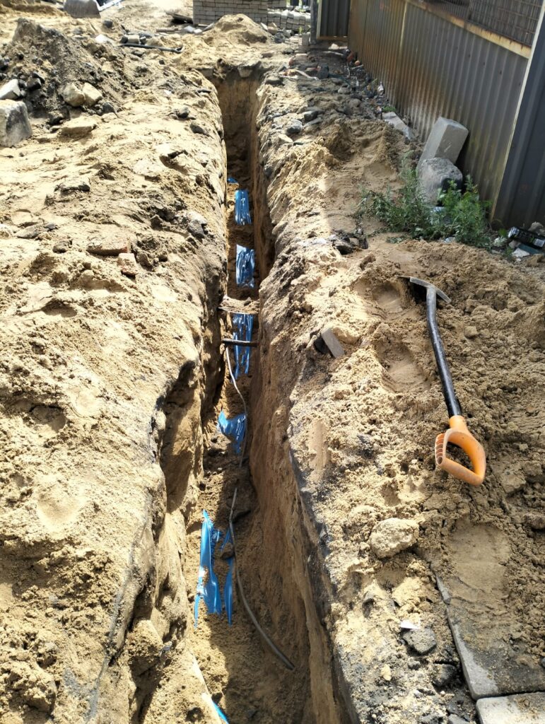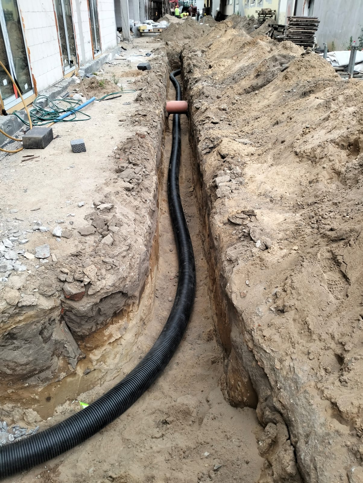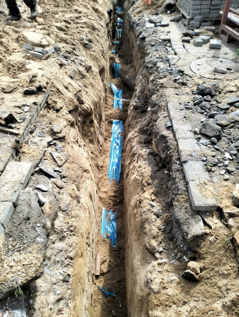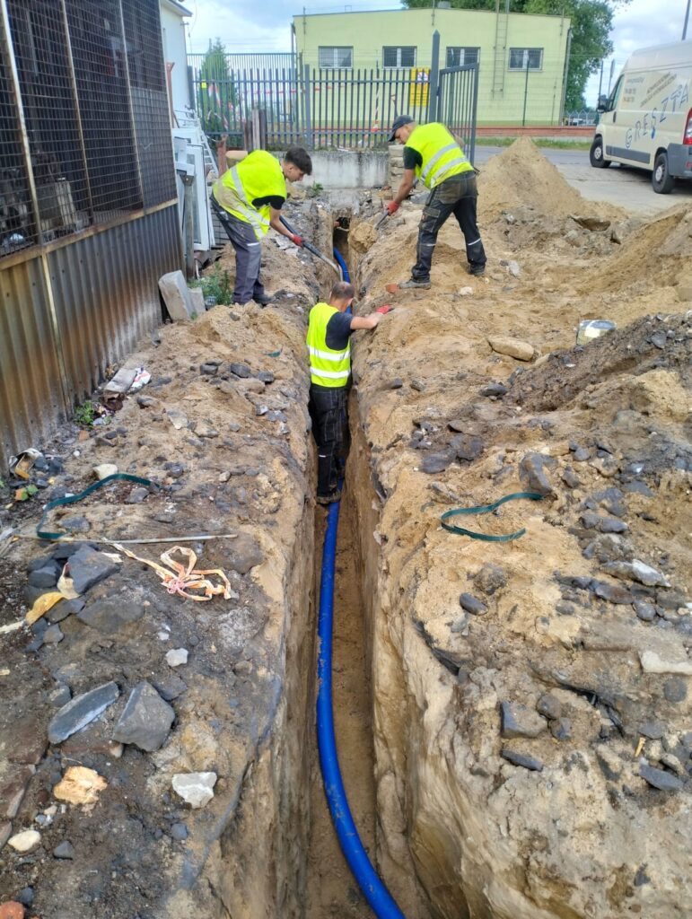Kompleksowa realizacja przyłącza wodociągowego oraz zasilania węzła cieplnego dla budynku mieszkalnego. Projekt obejmował wykonanie głębokich wykopów, montaż rur PE oraz izolowanych przewodów preizolowanych dla ciepłownictwa wraz z zabezpieczeniem wykopów systemem obudowy szczelnej. Wszystkie prace zostały wykonane zgodnie z wymogami technicznymi.
