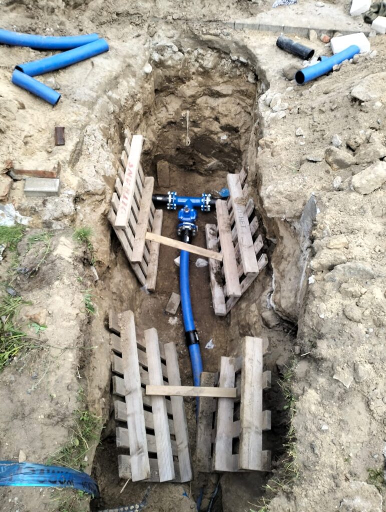 Dla przyłącza wodociągowego zastosowano niebieskie rury PE o średnicy dostosowanej do wymagań przepływu oraz normy ciśnieniowej. Rury PE zgrzewano metodą doczołową, tworząc jednolite połączenia bez użycia dodatkowych łączników. W kluczowym punkcie zamontowano studnię zaworową wykonaną z szalunków drewnianych, w której zainstalowano zawór odcinający z niebieską armaturą kołnierzową. Układ zaworu umożliwia odcięcie dopływu wody do budynku bez konieczności ingerencji w sieć magistralną. Studnia została zabezpieczona pokrywą umożliwiającą dostęp serwisowy.