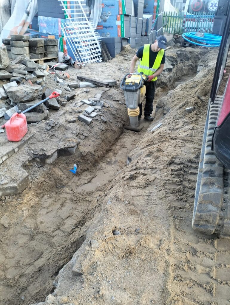 Równolegle z przyłączem wodociągowym wykonano przyłącze zasilania węzła cieplnego z wykorzystaniem rur preizolowanych. Widoczne na zdjęciach czarne rury z czerwonym i brązowym oznaczeniem zawierają wewnętrzne przewody stalowe otoczone izolacją z pianki poliuretanowej oraz zewnętrzną osłoną z PEHD. Rury preizolowane układano w wykopie z zachowaniem odpowiednich spadków oraz promieni łuków, a połączenia izolowano termokurczliwymi mufami zapewniającymi ciągłość izolacji. Zespół montażowy w żółtych kamizelkach wykonywał prace zgodnie z procedurami BHP, używając narzędzi mechanicznych do zagęszczania gruntu. Po zakończeniu montażu przystąpiono do warstwowego zasypywania wykopów z jednoczesnym zagęszczaniem każdej warstwy, co zapewnia stabilność podłoża oraz eliminuje przyszłe osiadanie gruntu.