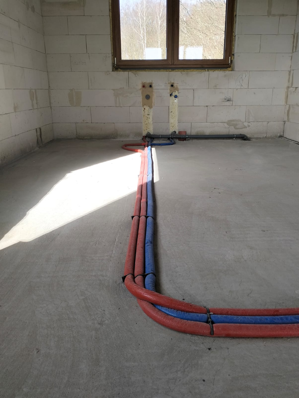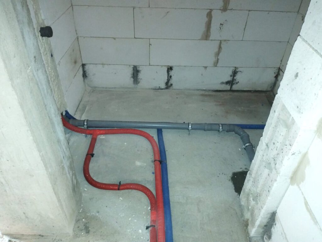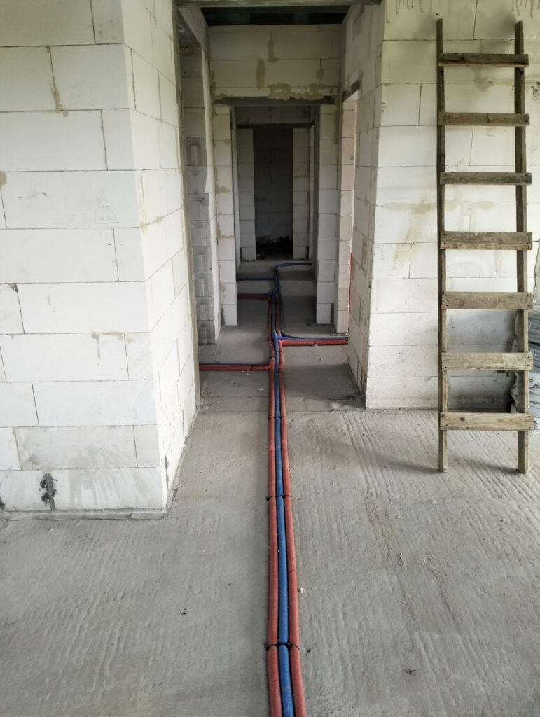 Prace montażowe rozpoczęto od szczegółowego wyznaczenia tras przebiegu wszystkich instalacji zgodnie z dokumentacją projektową oraz funkcjonalnym układem pomieszczeń. Zastosowano kolorowy system oznakowania przewodów, który znacząco ułatwia rozróżnienie instalacji oraz późniejsze prace serwisowe. Niebieskie rury oznaczają wodę zimną, czerwone wodę ciepłą, a szare kanalizację sanitarną. Wszystkie przewody zostały ułożone w posadzce, co pozwala na ich całkowite ukrycie pod przyszłą wylewką oraz finalnym wykończeniem podłogi.